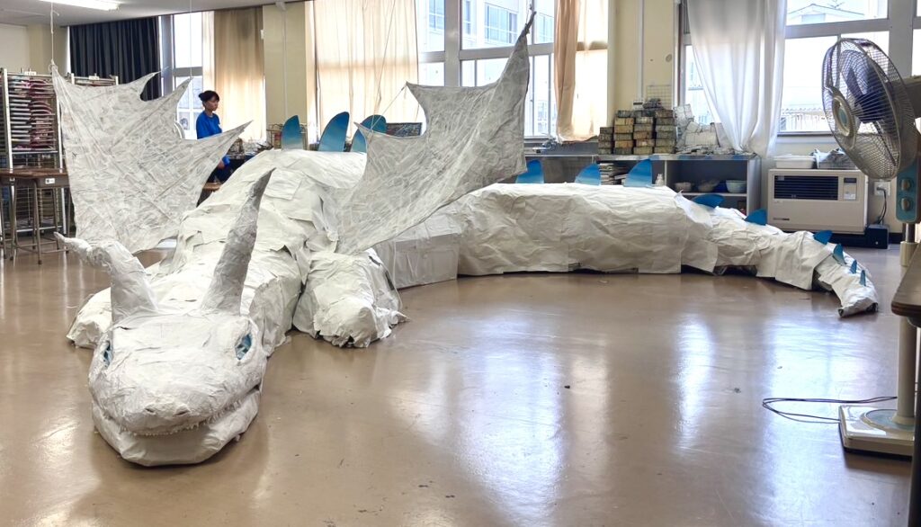 私たちは、文化祭の展示のためにドラゴンを作成しました。約1ヶ月かけて、模型や翼、顔を仲間と協力して作りあげました。