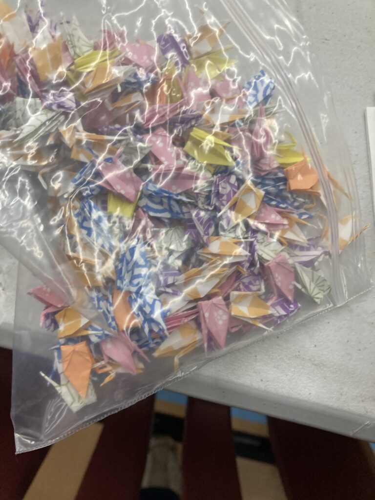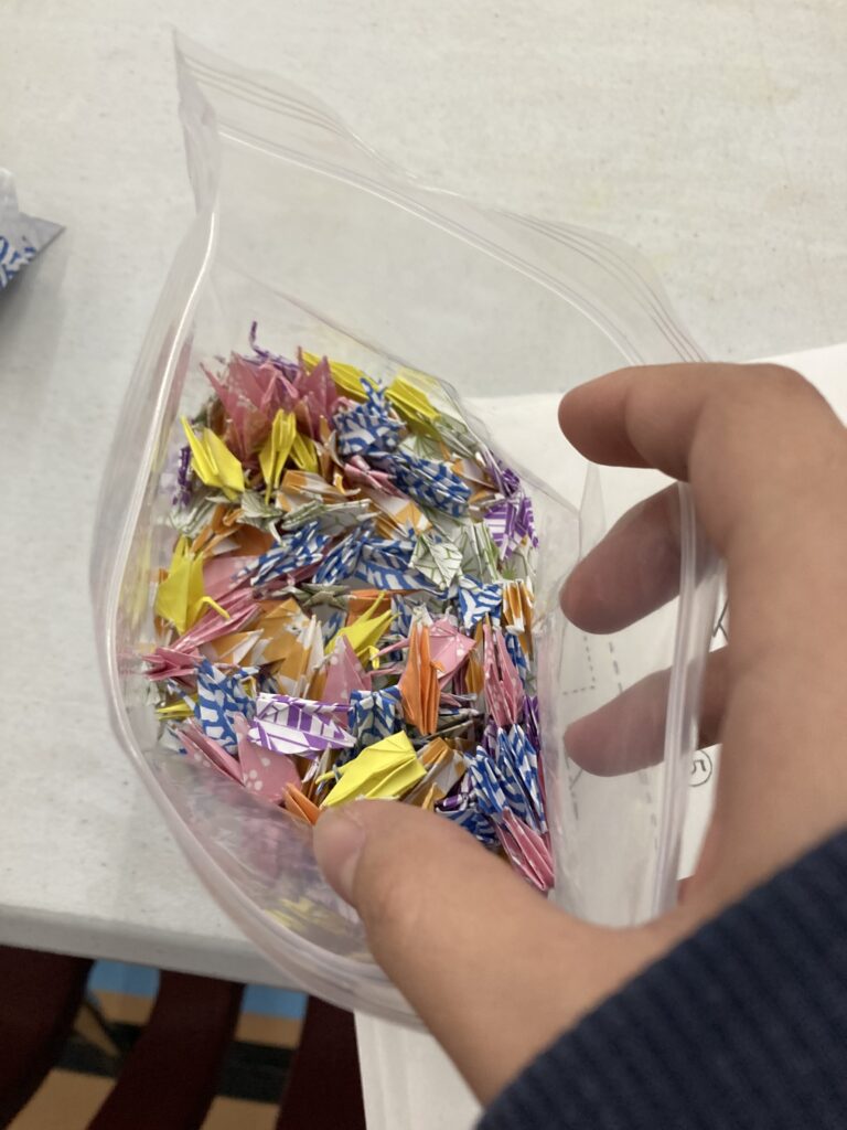 通常の15cm折り紙を16分の1に切り作った鶴です。3週間ほどで200羽超の鶴を作りました。