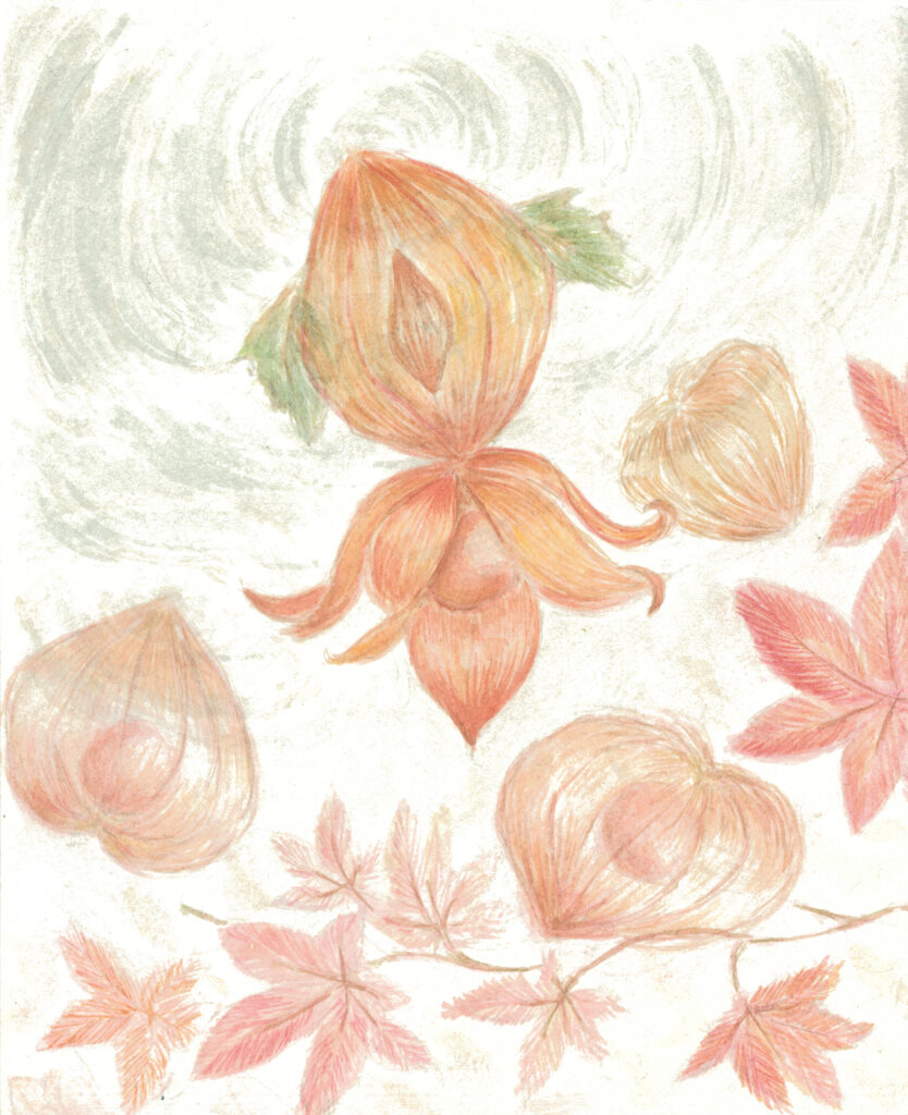 金魚とほおずきの繊細で透きとおる部分があるところに共通するものを感じ、組み合わせようと思いました。金魚のシルエットと、ほおずきの透けている表面部分に特に力を入れました。
